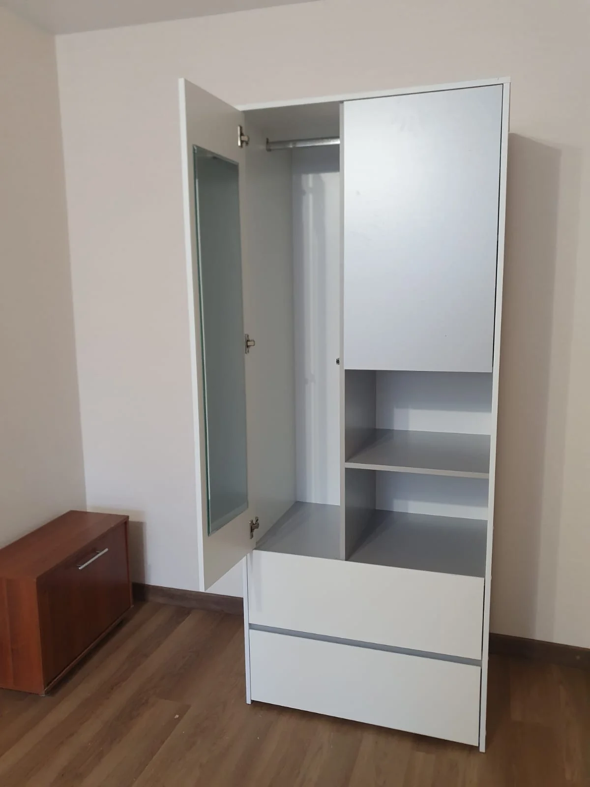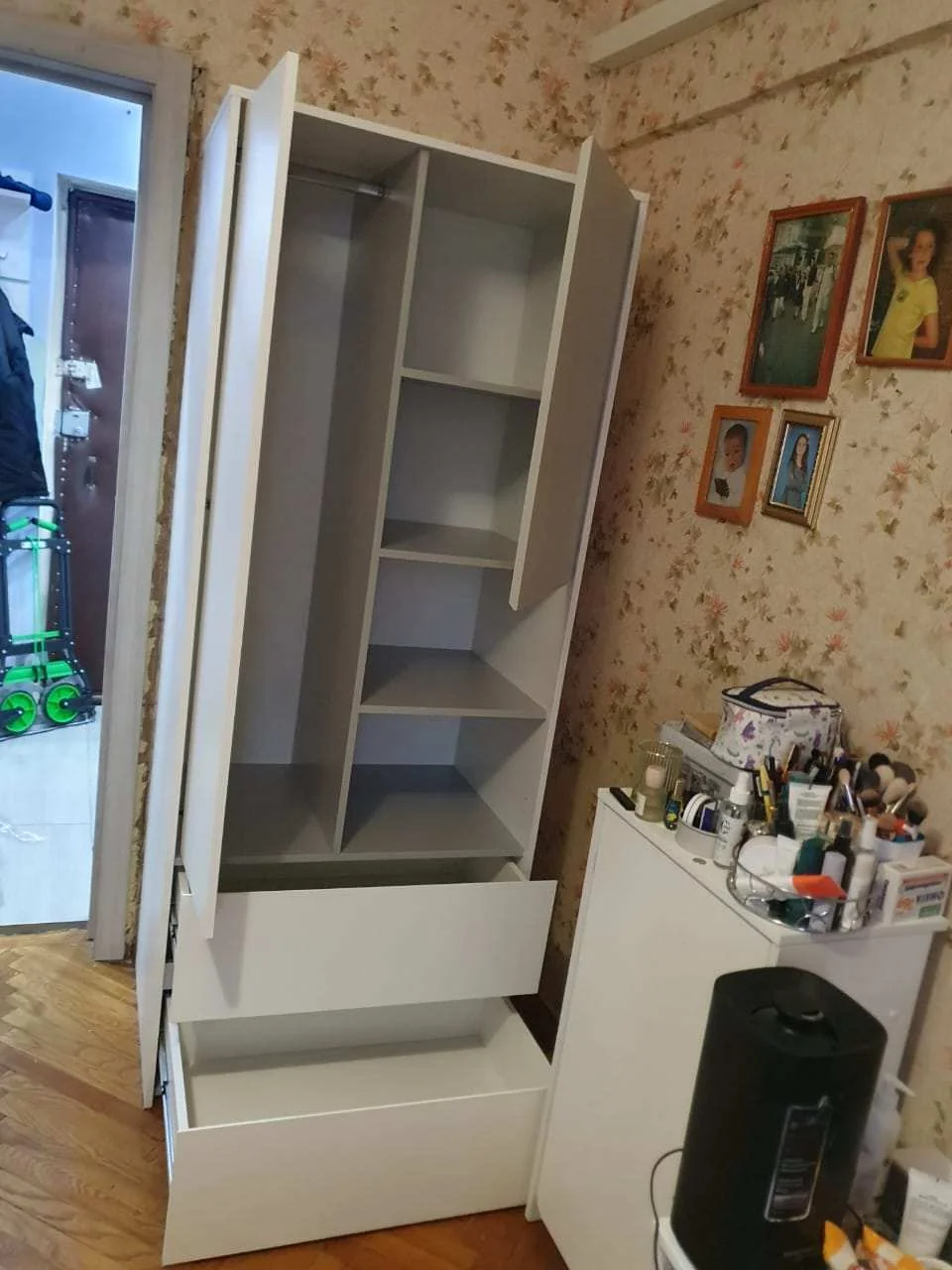 Внутри полки, выдвижные ящики и секция с горизонтальной штангой.