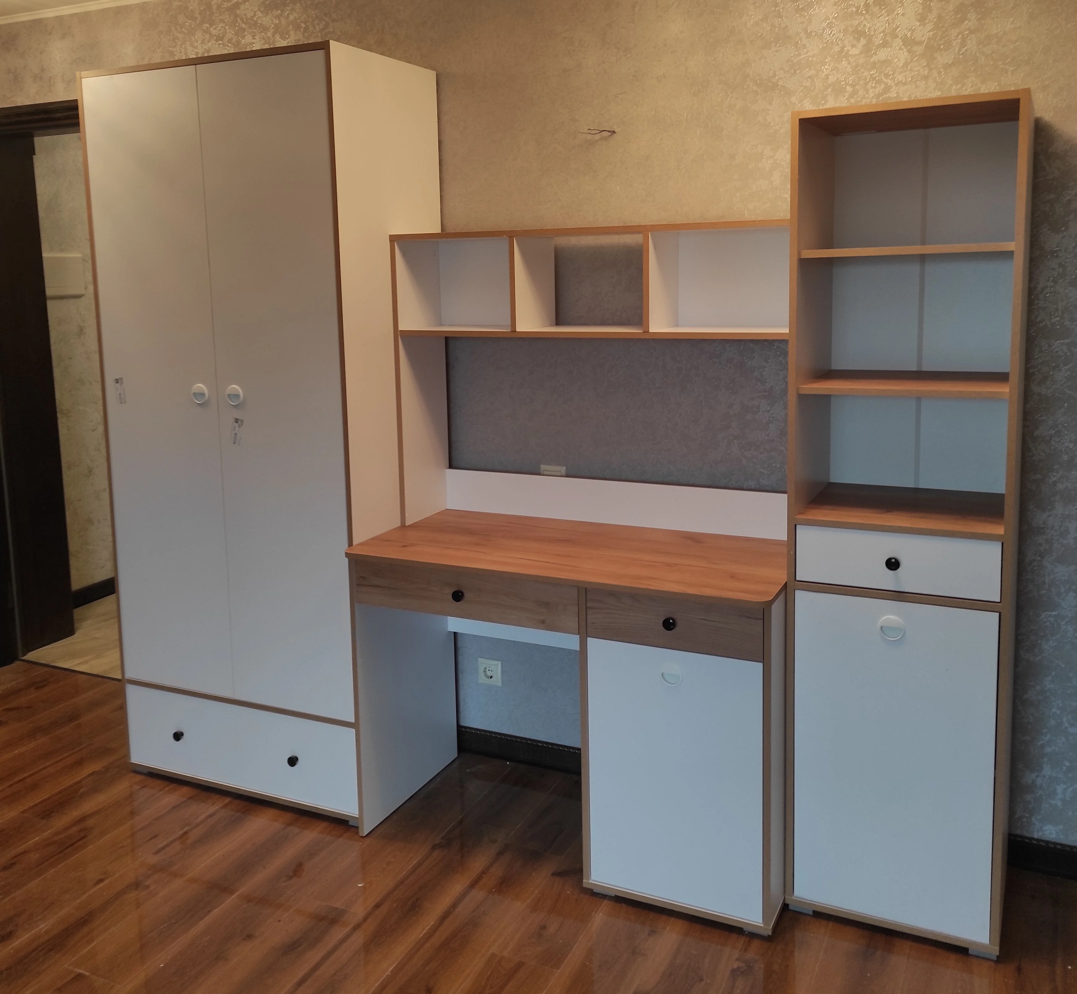 Вверху два выдвижных ящика, справа тумба с распашной дверцей.