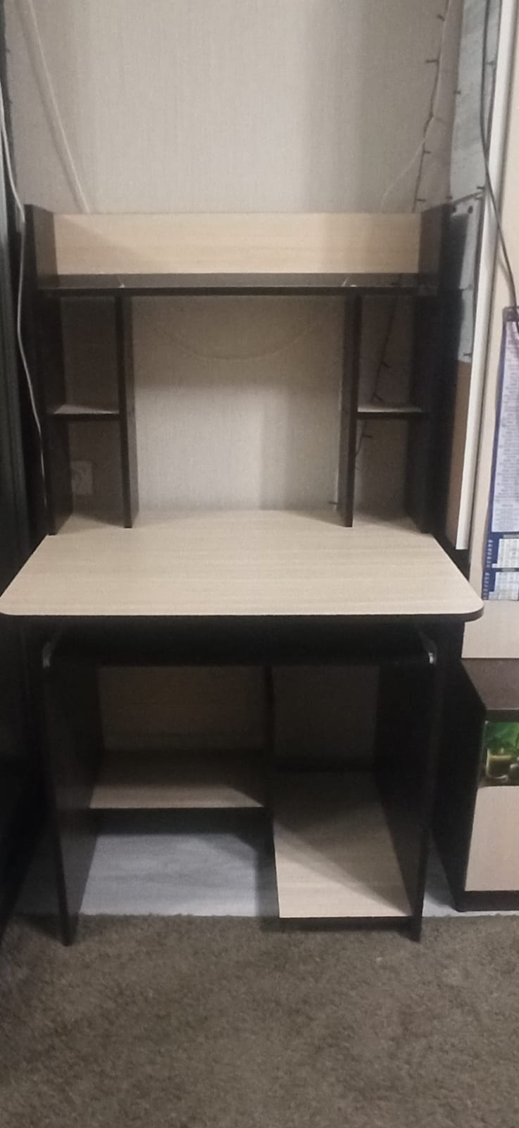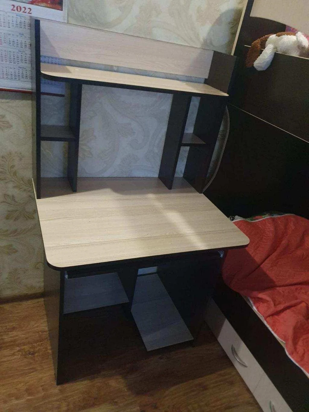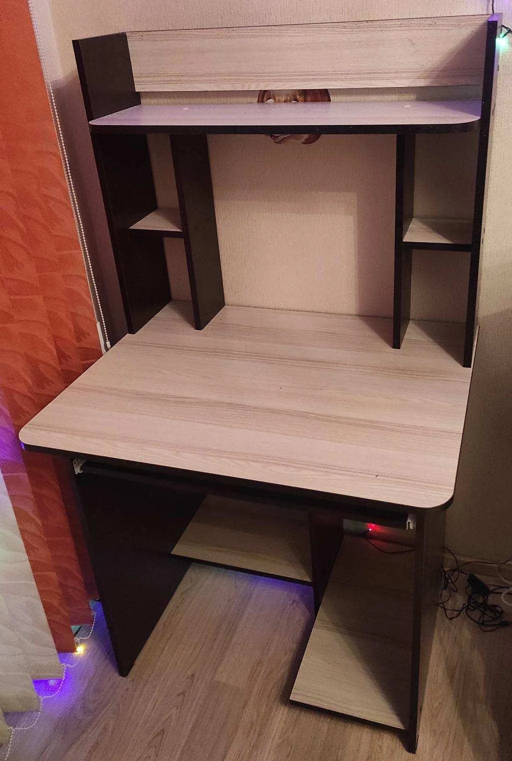 У стола имеются открытые полки, на которых можно расположить книги или самые необходимые вещи, отдельная ниша под системный блок и выдвижная полка под клавиатуру. Стол изготавливается из высококачественного ЛДСП в классическом сочетании цветов.