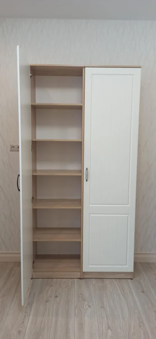 Шкаф оснащен глухой распашной дверцей, за которой гардеробная и обувная полки и вешалка для плечиков с одеждой.