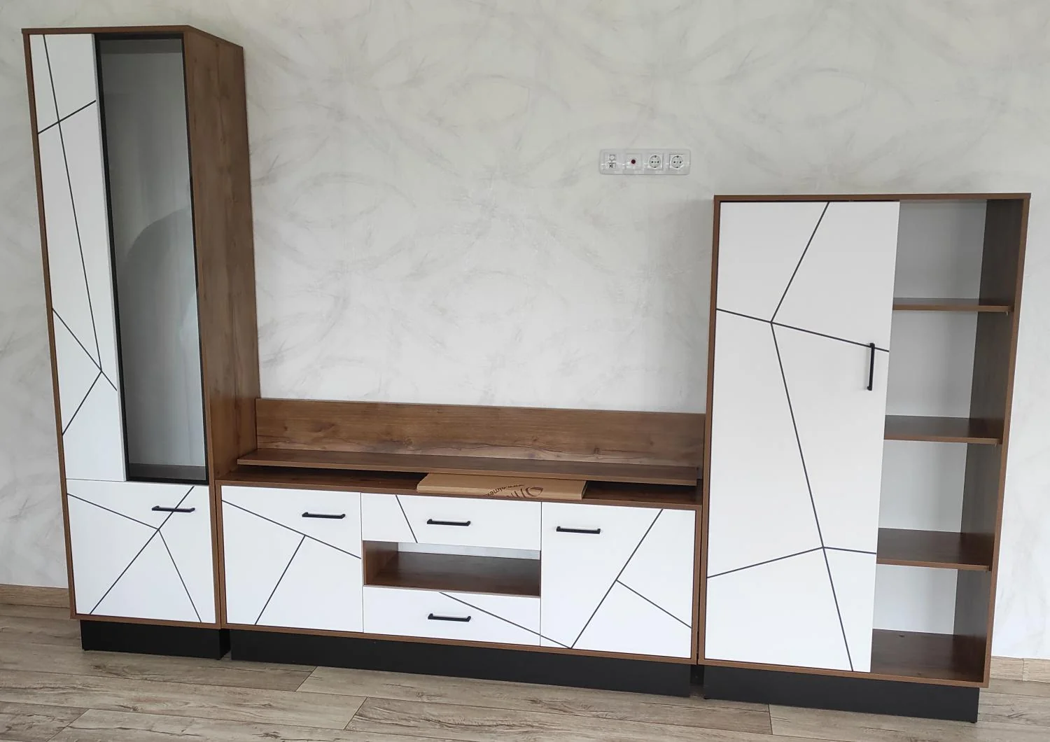 Современная модульная система для гостиной сделает комнату уютной и упорядочит все вещи. Ручки выполнены из пластика. Направляющие шариковые. Фасад комбинированный МДФ в пленке ПВХ с фрезеровкой УФ-печатью.Все модули можно купить по раздельности.