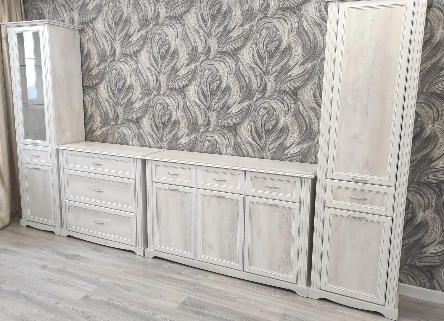 Светлая модульная система Сохо несет благородный дизайн и легкость цвета. Ручки металл, направляющие шариковые, фасад комбинированный рамочный. Все модули могут стоять в любом порядке.
