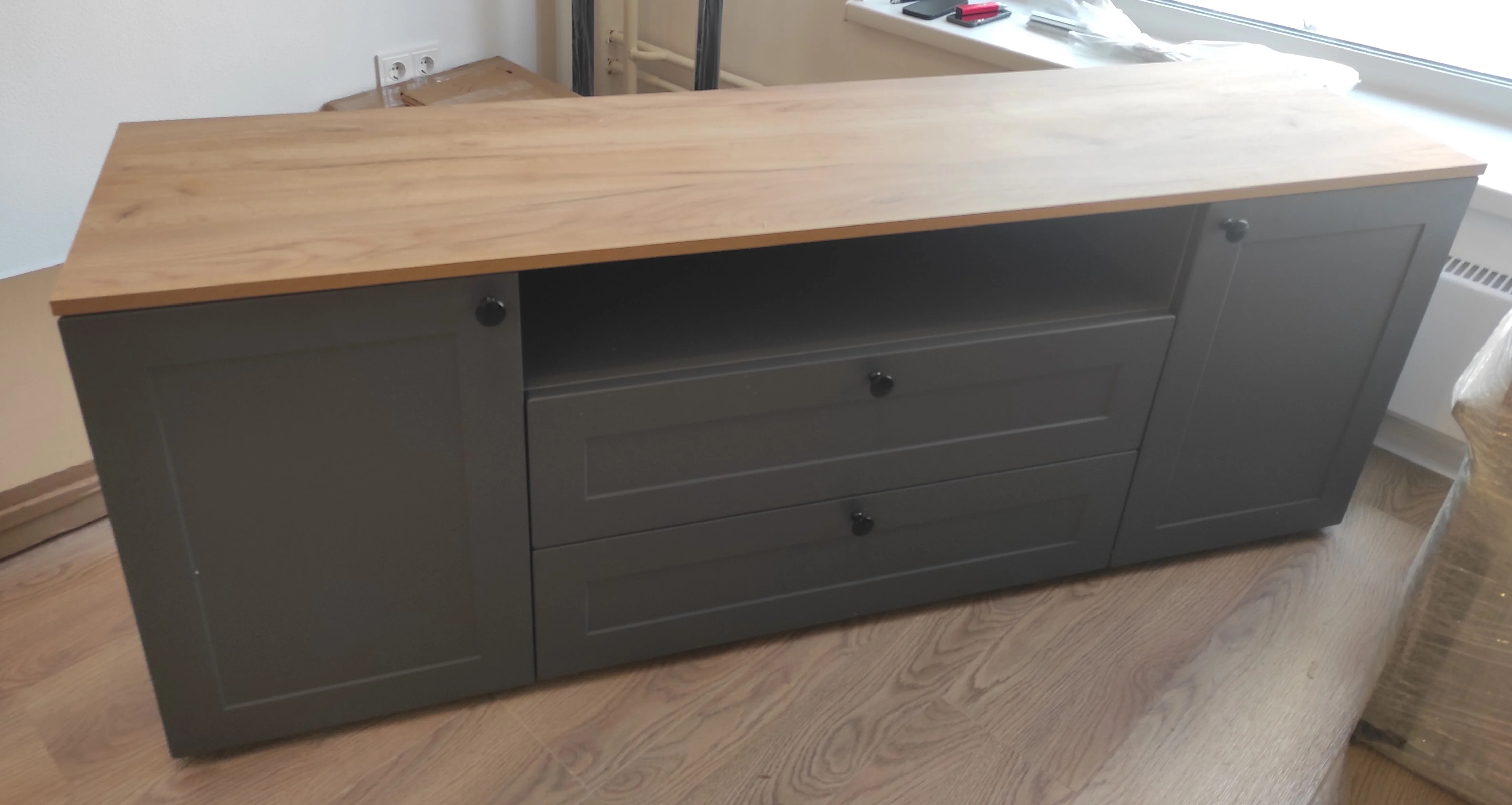 Остин Тумба под ТВ 16.47 графит/дуб золотой поможет разместить большой современный телевизор в гостиной или спальне.В центре под столешницей открытая поилка для техники и 2-а выдвижных ящика для хранения мелких предметов.