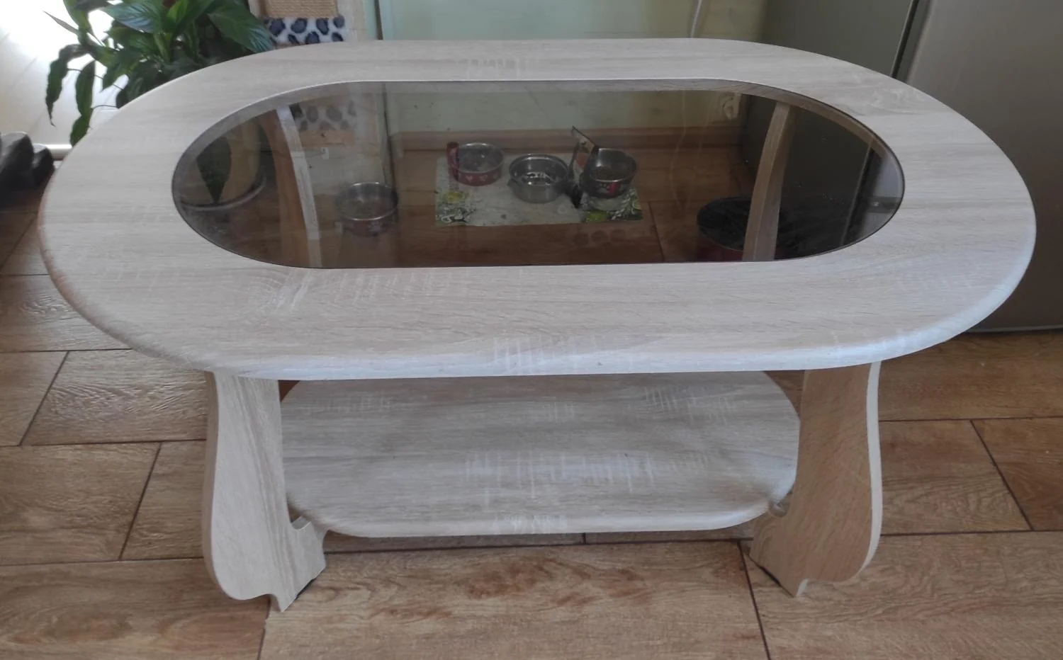 Стол журнальный СЖ-21 дуб сонома - изящное изделие для гостиной или спальной комнаты.Столешницы овальные, верхняя со стеклянной вставкой.