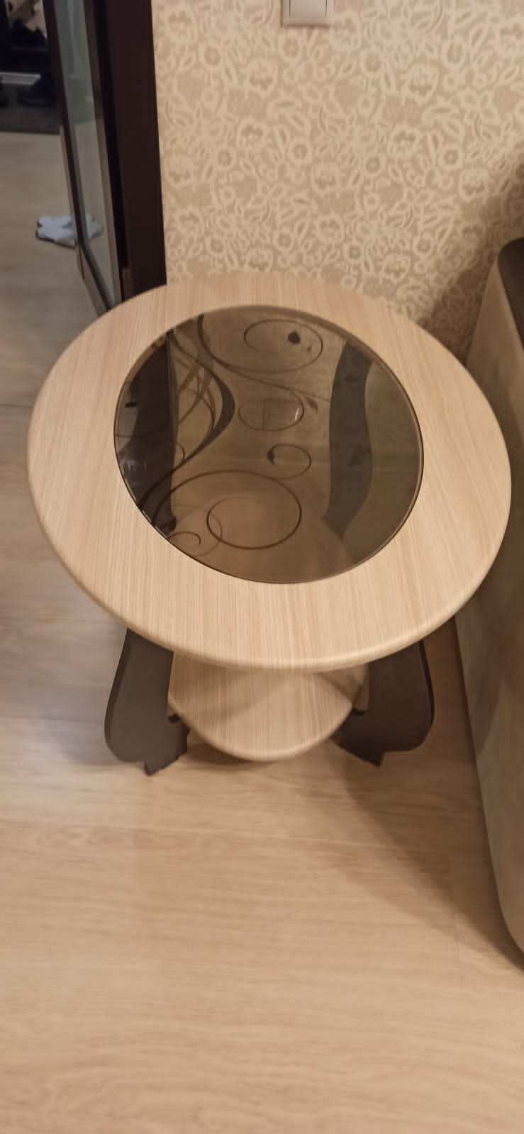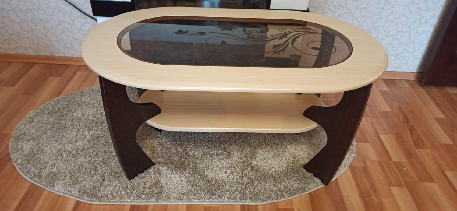 Столешницы овальные, верхняя со стеклянной вставкой с рисунком.
