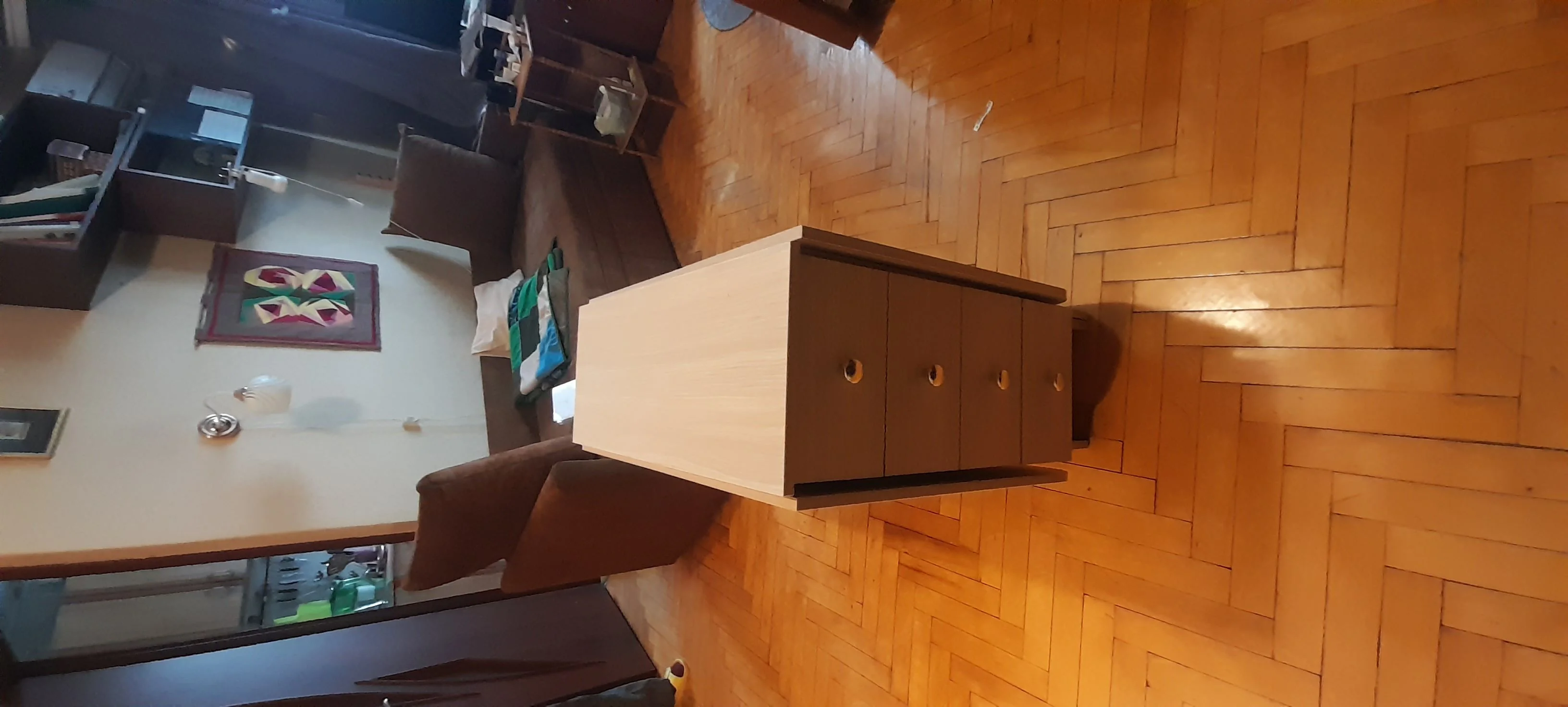 Конструкция с центральной тумбой с глухой дверцей, за которой ниша для хранения сопутствующих предметов интерьера.