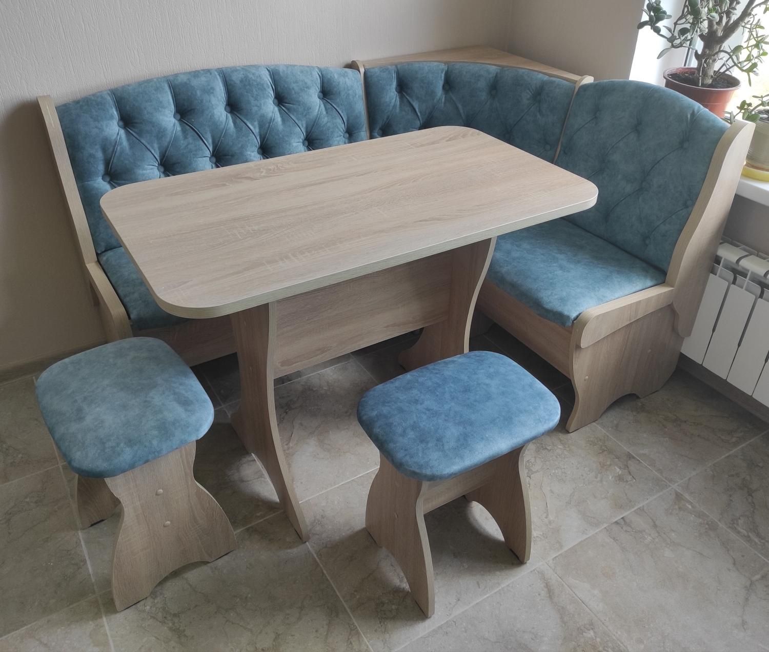 В состав набора входят: угловой диван, обеденный стол и 2 табурета.