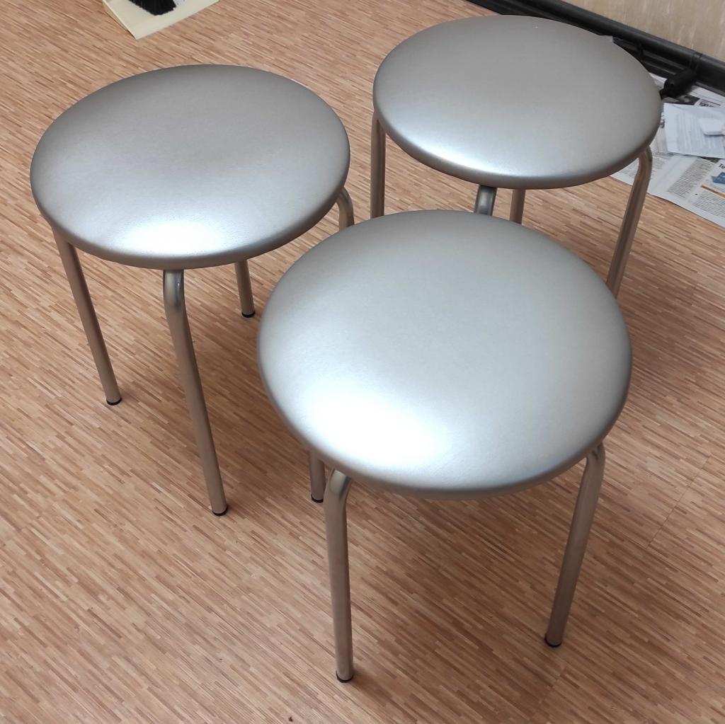 Изделие имеет компактные размеры, гнутые металлические ножки и круглое мягкое сидение.