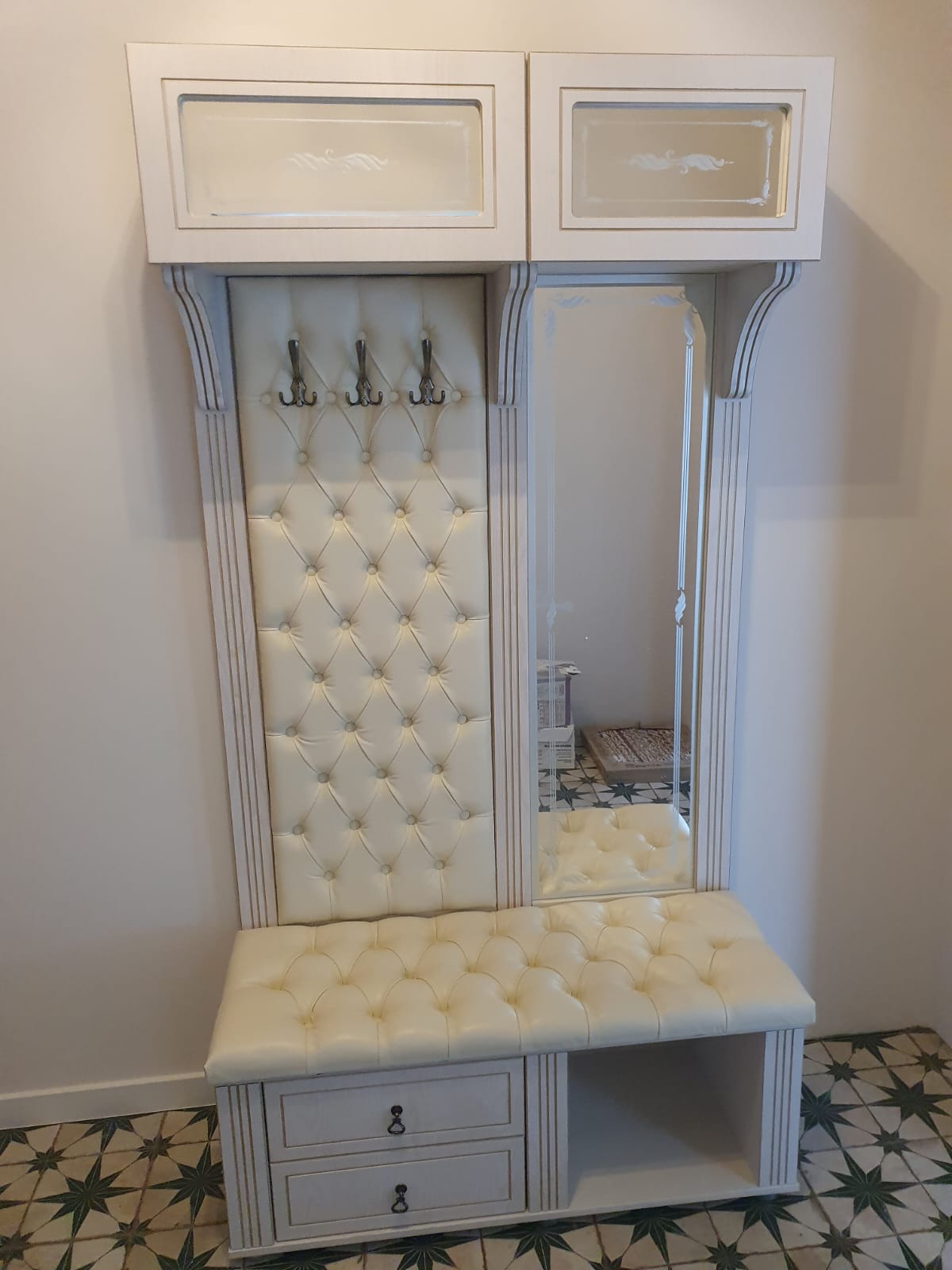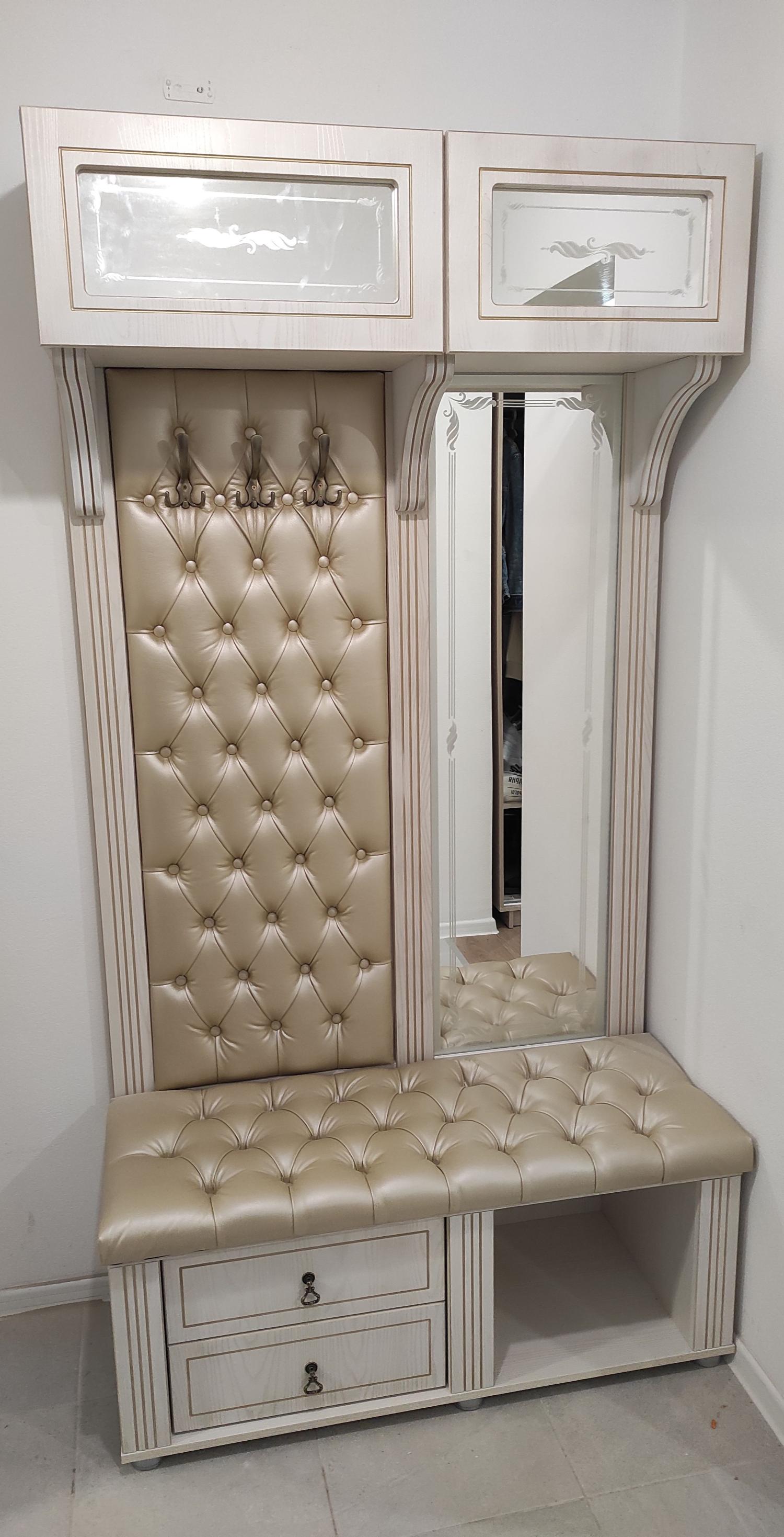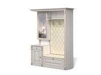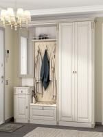 Имеются верхние полки с дверцами, зеркало и тумбы для обуви.