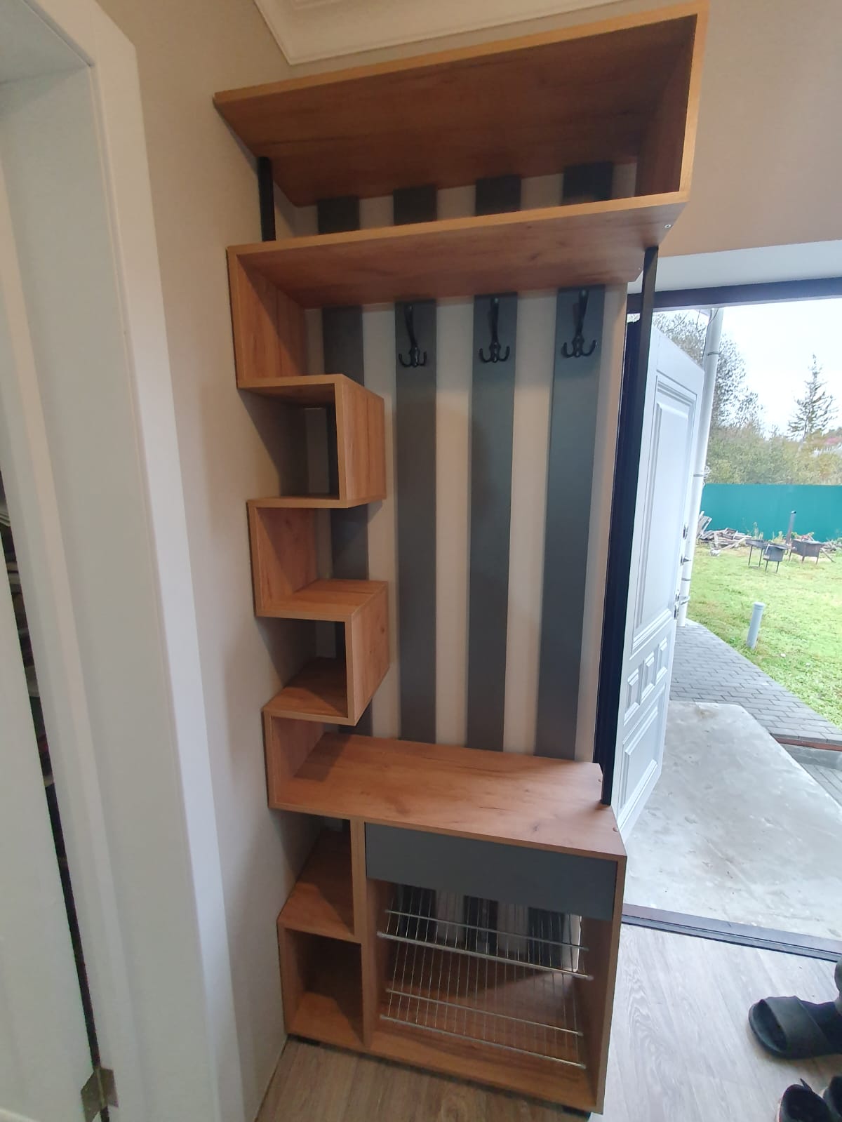 Очень интересная мини прихожая. Смотрится стильно. Есть все, что нужно для небольшой прихожей. Полочки, вешалка, ящик для мелочей и небольшая обувница. Качество мебели и фурнитуры отличное. Спасибо за быструю доставку и сборку!