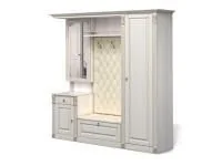 Прихожая Вероника-4 выполнена в классическом стиле с использованием декоративных элементов. Фасады имеют покрытие патиной, что придает изделию особый внешний вид. Мягкие элементы, вешалка и сиденье, выполнены с обивкой качественной экокожей и имеют каретную стяжку.Конструкция с открытой вешалкой с тремя крючками для верхней одежды, полкой для головных уборов, тумбой для обуви с сиденьем и комбинированным пеналом с зеркалом. Зеркало открывается, предоставляя доступ к полочкам. В составе набора также присутствуют одностворчатый и двухстворчатый шкаф.