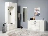 Имеются полки для хранения, зеркало, крючки для верхней одежды и тумба для обуви.
