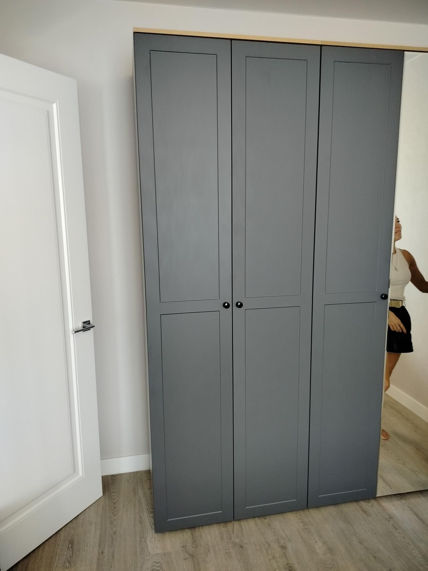 Внутри гардеробная полка, штанга для плечиков и три выдвижных ящика для хранения мелких предметов.