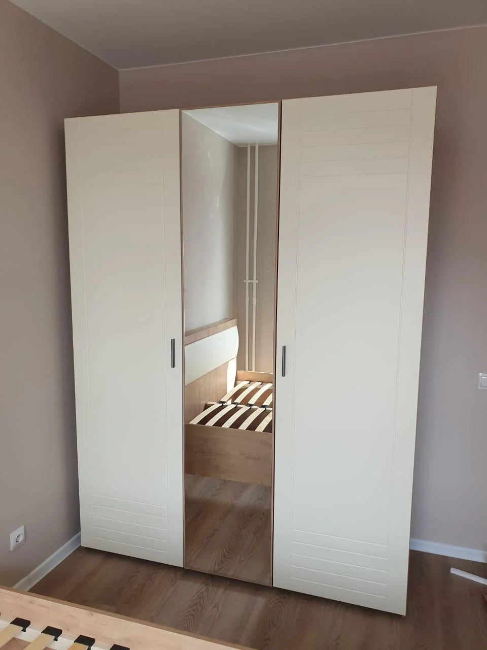Шкаф имеет две секции, закрывающиеся тремя распашными дверцами. Центральная дверь зеркальная. Внутри расположены 9 полок для хранения и горизонтальная штанга для плечиков с одеждой.
