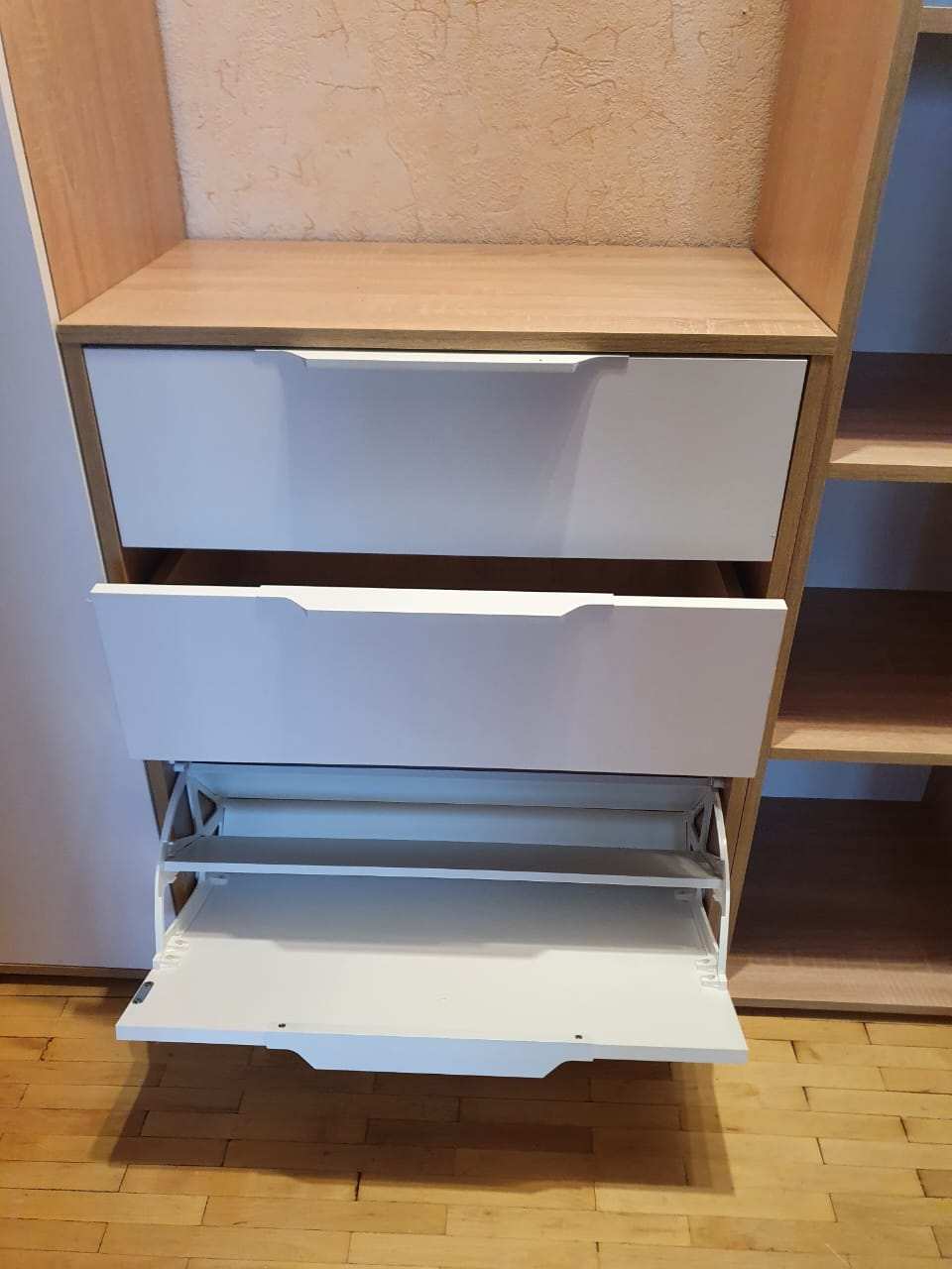 Конструкция с 2я выдвижными ящиками вверху и откидной секцией для обуви внизу.