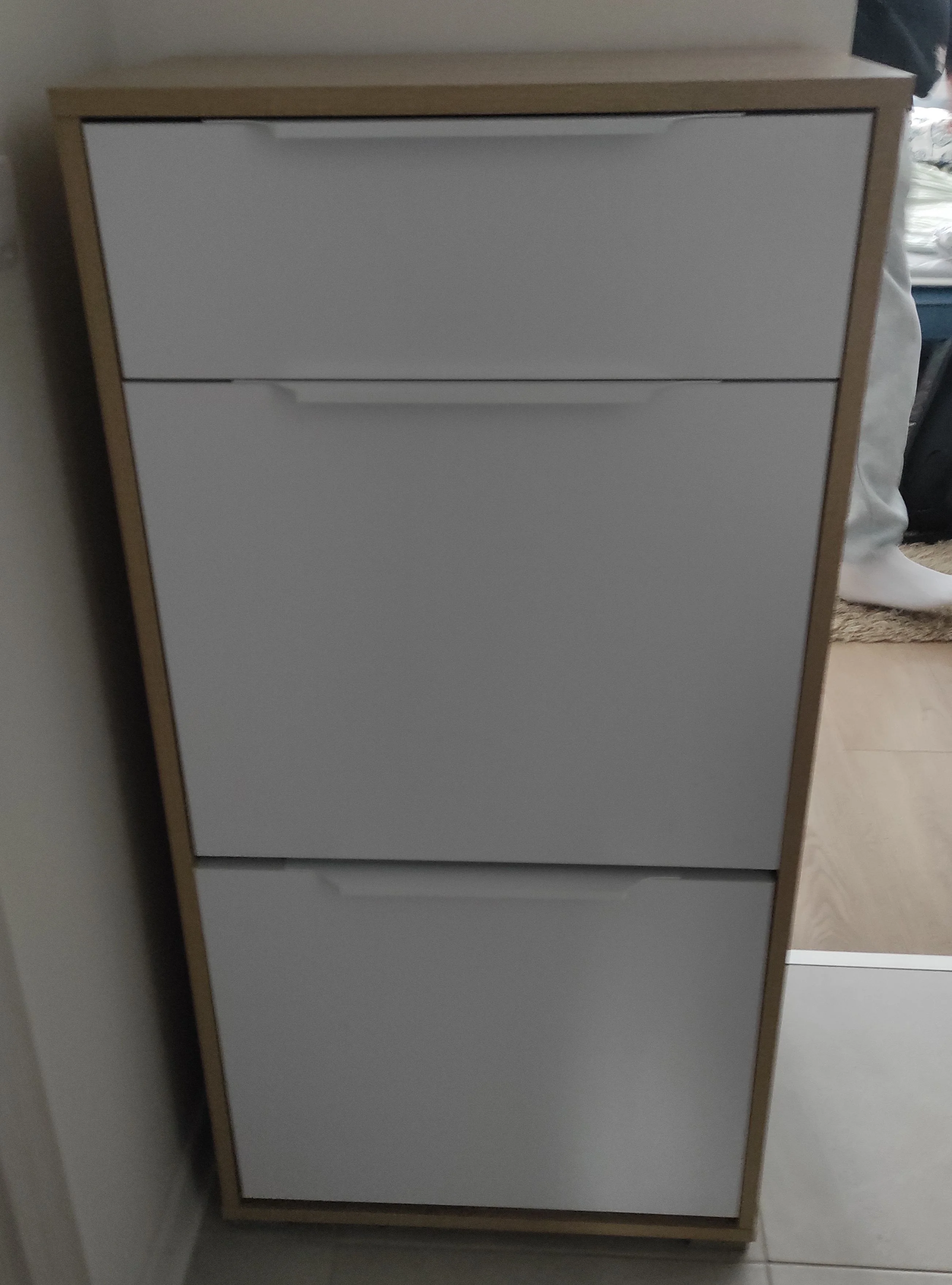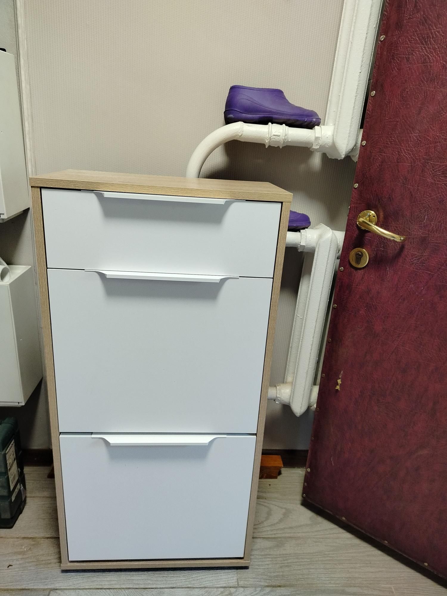Конструкция с выдвижным ящиком вверху и 2я откидными секциями для обуви внизу.