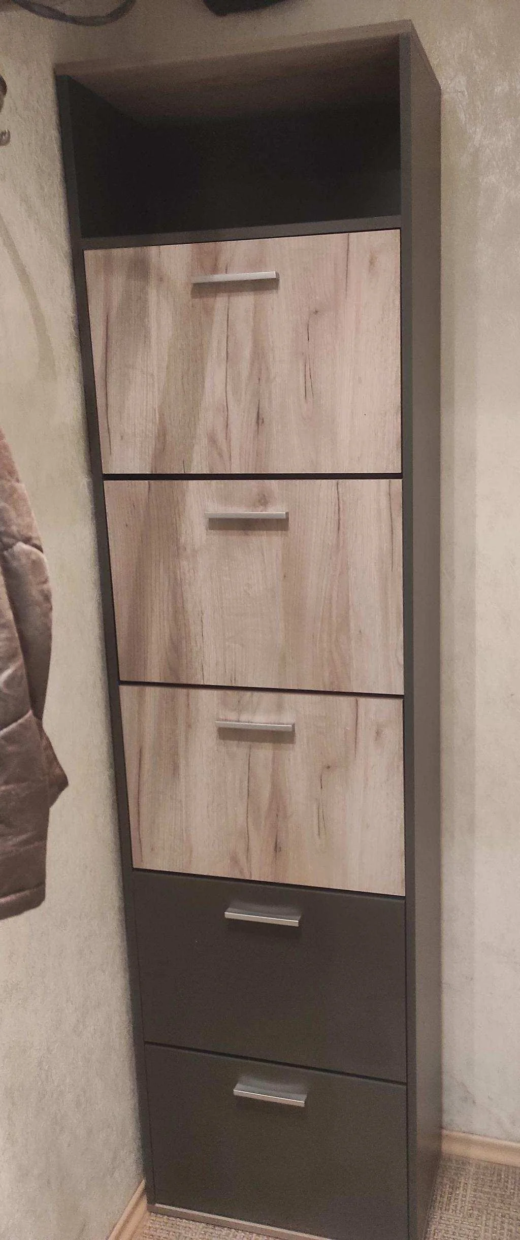 НМ 013.26 Тумба для обуви Санти Антрацит/Дуб крафт серый узкая модель для хранения обуви в прихожей или коридоре.Модель оборудована 5-ю откидными секциями для обуви и открытой полкой для мелочей.