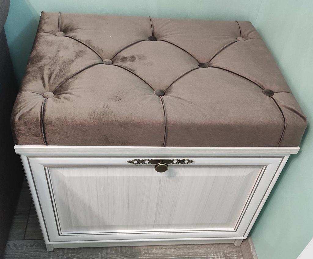 Тумба для обуви Габриэлла М06. Выполнена в классическом стиле. Ткань для обивки декоративной части: велюр. Компактное место для хранения обуви или других вещей. - Доставка по Москве в пределах МКАД - 895 руб.