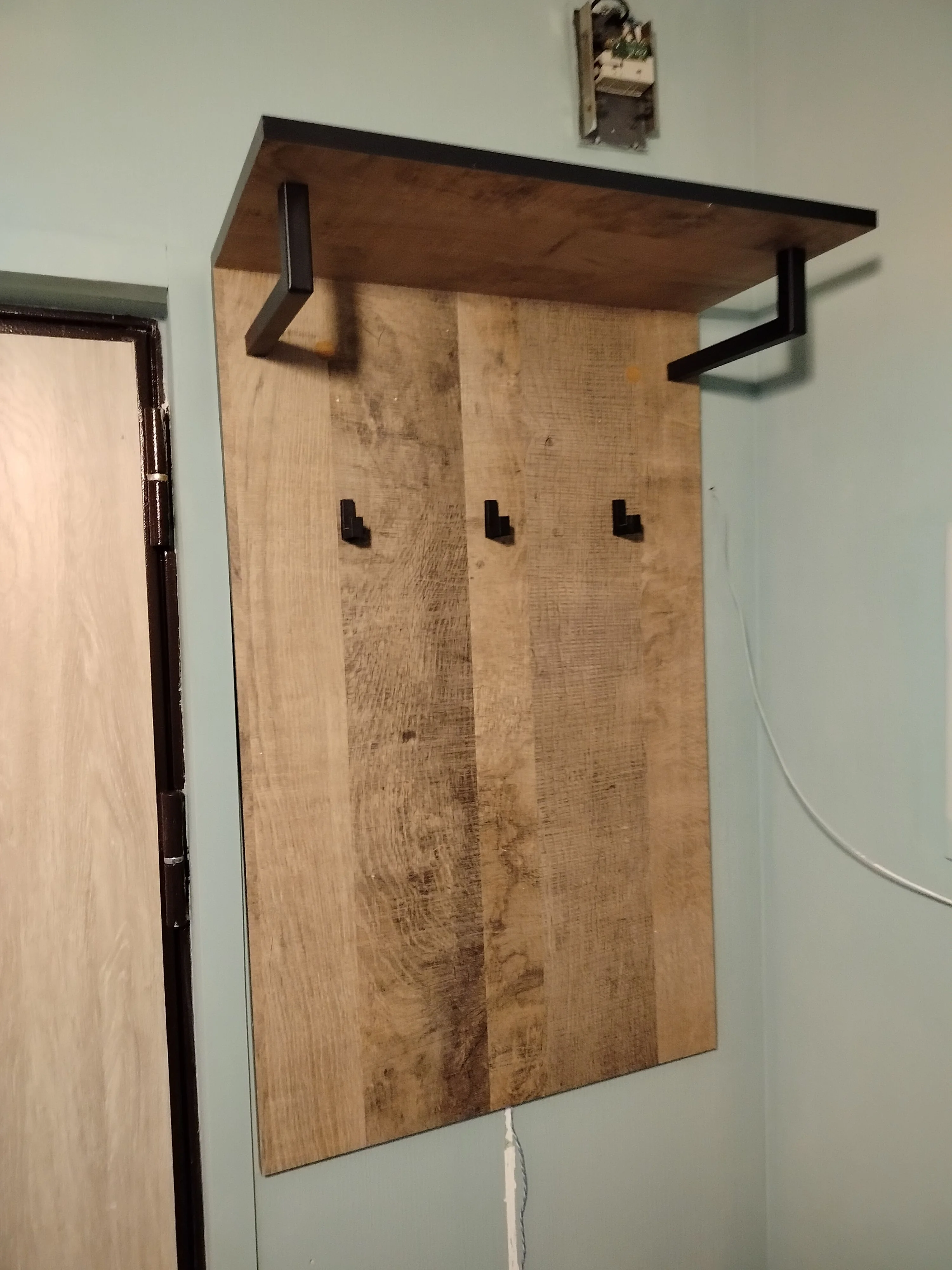 Модель имеет гардеробную полку, под которой расположены два уголка для плечиков с одеждой и 3-и крючка.