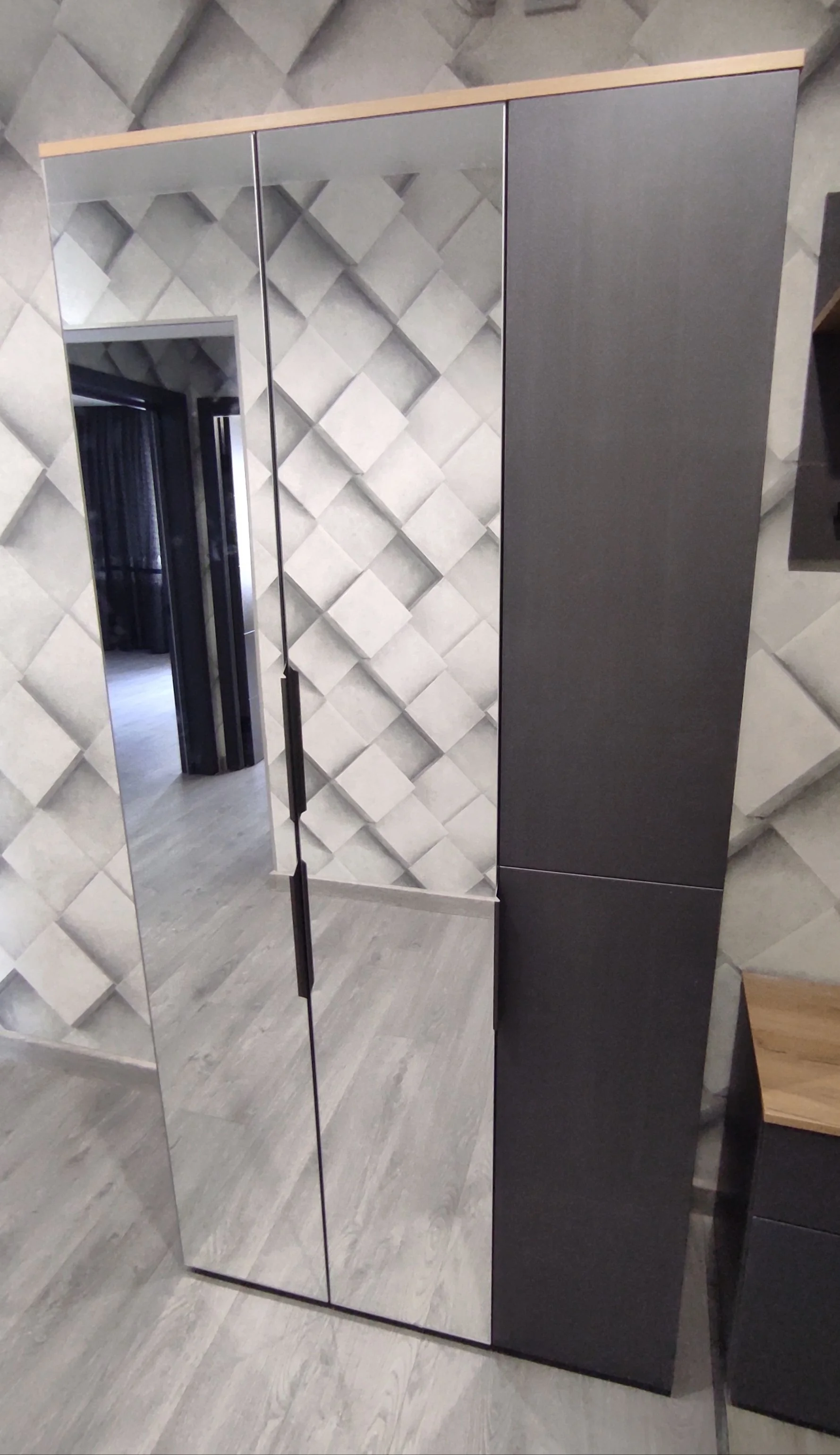 Октава Шкаф для одежды 13.338 Серый графит/Дуб Вотан - вместительный и яркий шкаф для прихожей комнаты.Конструкция с 2-я зеркальными распашными дверцами.