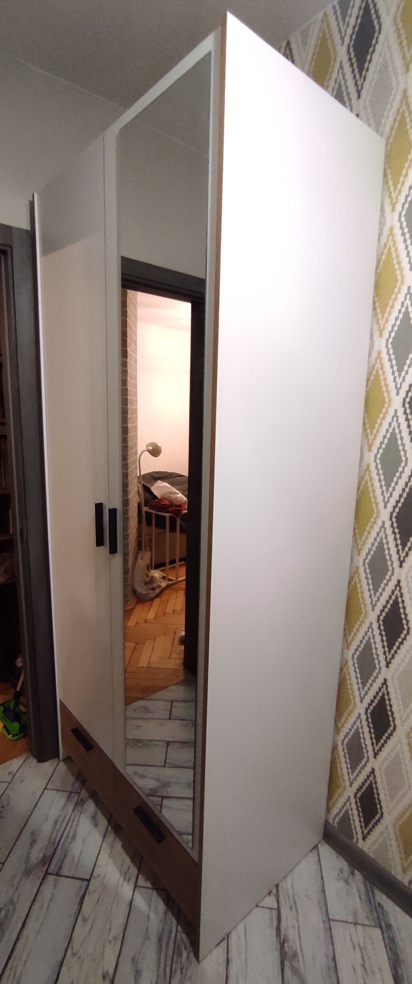 Секция закрывается 2-я распашными дверцами, одна из которых оснащена зеркалом.
