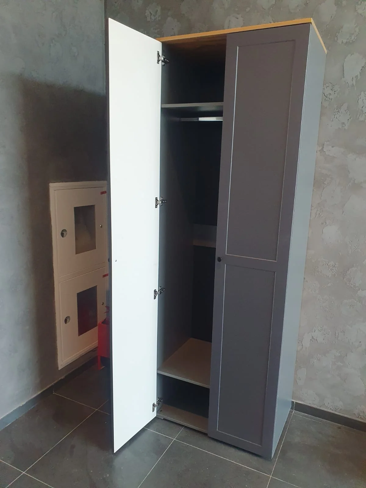 Внутри 2-е полки и горизонтальная штанга для плечиков.