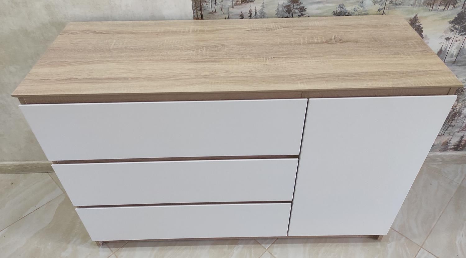 Широкий современный комод из высококачественных материалов подойдет для любой комнаты. Ручки на ящиках комода не предусмотрены. Сверху ящиков идет спил под углом 45 градусов, что позволяет выдвигать ящики взявшись сверху. Модель выполнена из ЛДСП толщиной 16 мм. - Доставка по Москве в пределах МКАД - 1200 руб.
