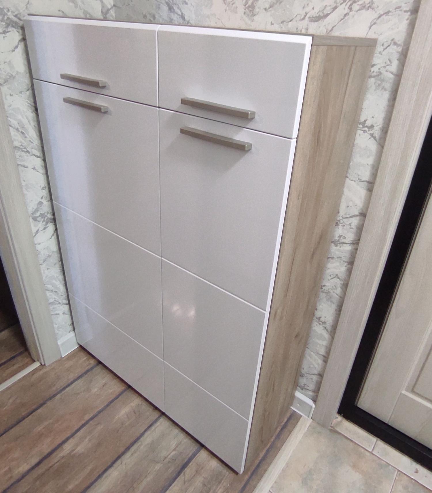 Конструкция с 2я выдвижными ящиками вверху и двумя секциями с дверками для обуви внизу.