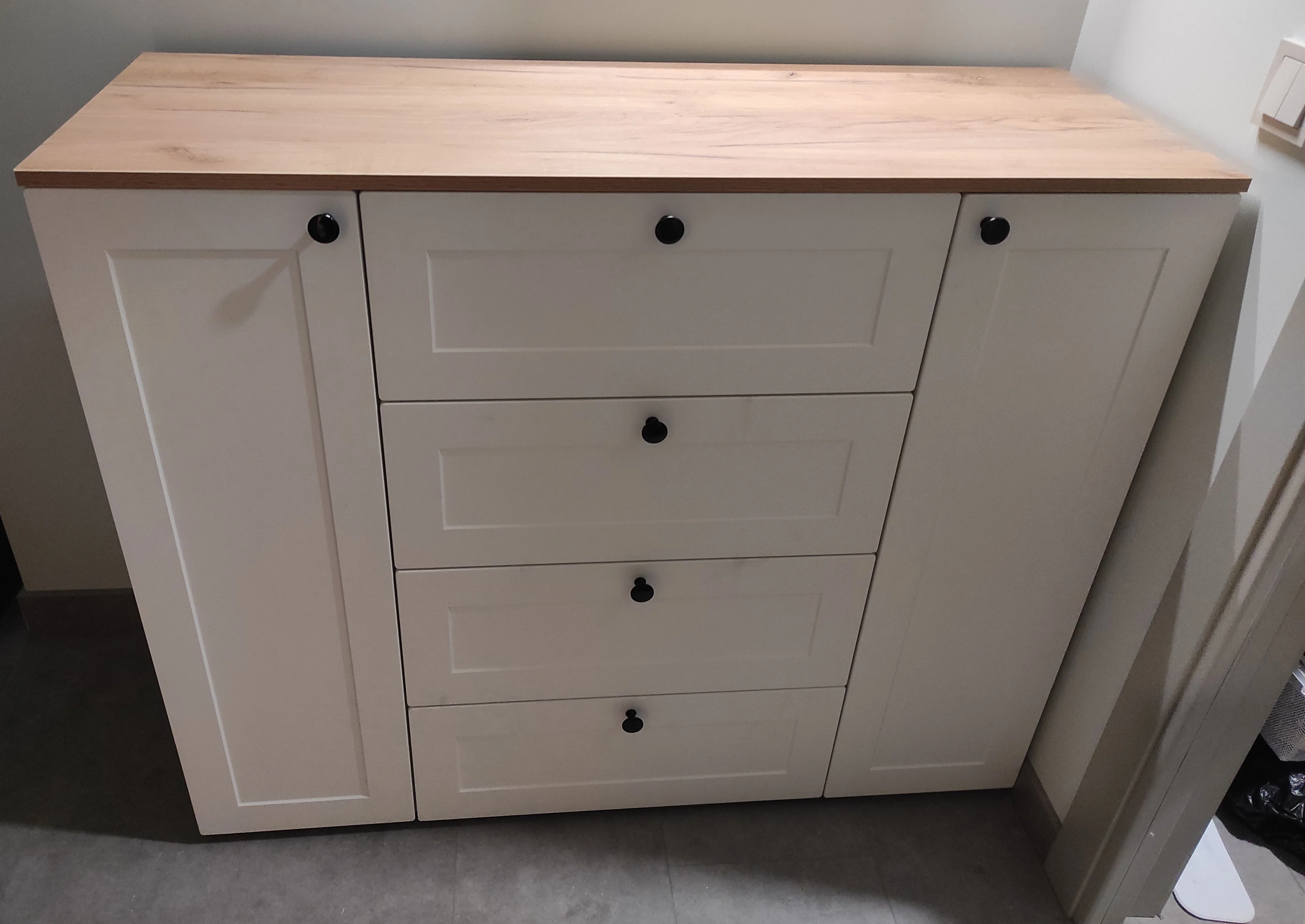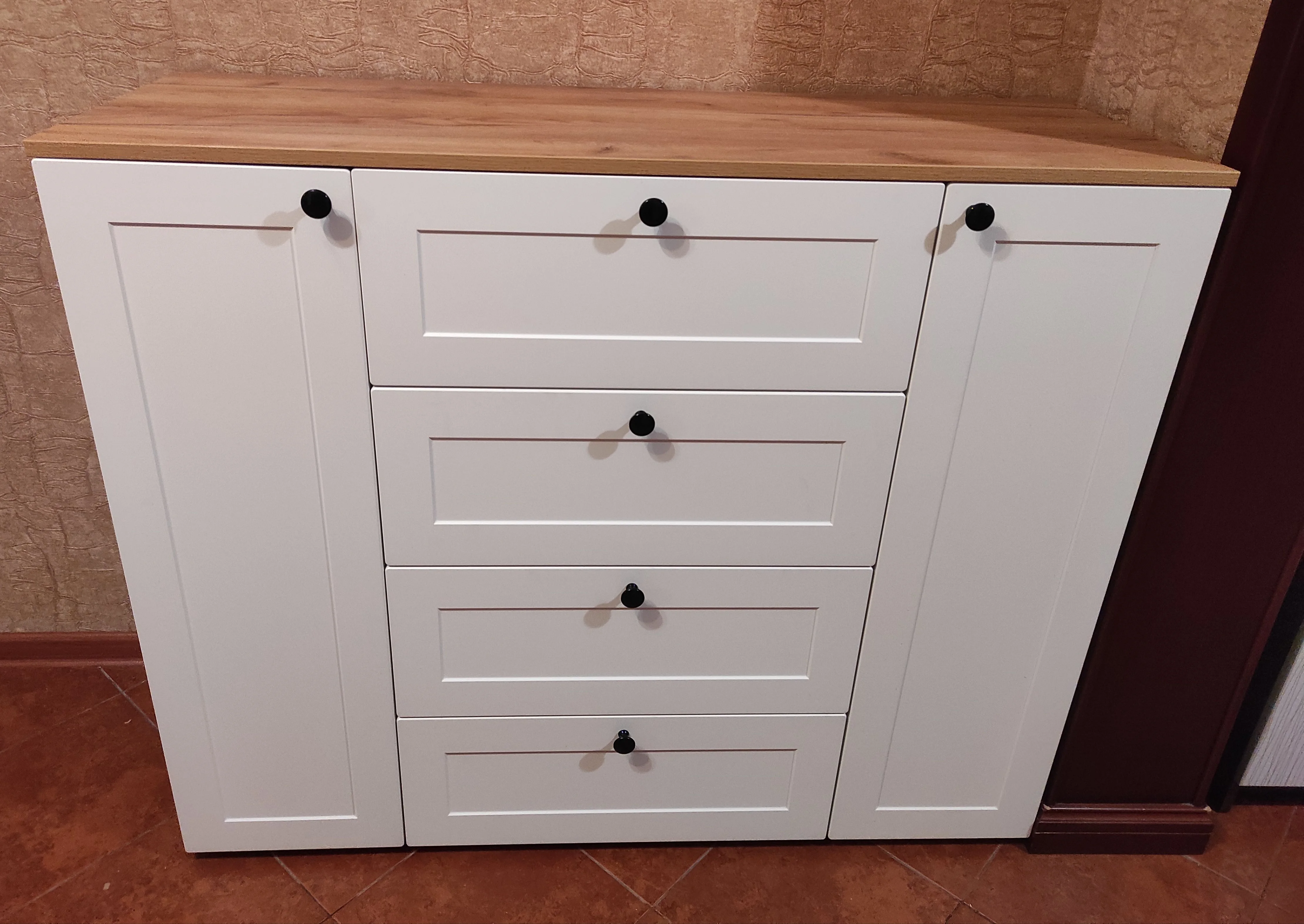 В центре 3-и выдвижных ящика, слева и справа отделения с дверцами и полками.